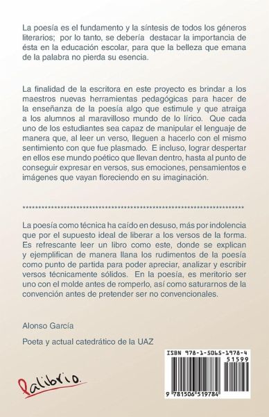 La poesa es el fundamento y la sntesis de todos los gneros literarios; por lo tanto, se debera destacar la importancia de sta en la educacin escolar, para que la belleza que emana de la palabra no pierda su esencia. La finalidad de la escritora en este proyecto es brindar a los maestros nuevas herramientas pedaggicas para hacer de la enseanza de la poesa algo que estimule y que atraiga a los alumnos al maravilloso mundo de lo lrico. Que cada uno de los estudiantes sea capaz de manipular el lenguaje de manera que, al leer un verso, lleguen a hacerlo con el mismo sentimiento con que fue plasmado. E incluso, lograr despertar en ellos ese mundo potico que llevan dentro, hasta al punto de conseguir expresar en versos, sus emociones, pensamientos e imgenes que vayan floreciendo en su imaginacin. La finalidad de la escritora en este proyecto es brindar a los maestros nuevas herramientas pedaggicas para hacer de la enseanza de la poesa algo que estimule y que atraiga a los alumnos al maravilloso mundo de lo lrico. Que cada uno de los estudiantes sea capaz de manipular el lenguaje de manera que, al leer un verso, lleguen a hacerlo con el mismo sentimiento con que fue plasmado. E incluso, lograr despertar en ellos ese mundo potico que llevan dentro, hasta al punto de conseguir expresar en versos, sus emociones, pensamientos e imgenes que vayan floreciendo en su imaginacin. La poesa como tcnica ha cado en desuso, ms por indolencia que por el supuesto ideal de liberar a los versos de la forma. Es refrescante leer un libro como este, donde se explican y ejemplifican de manera llana los rudimentos de la poesa como punto de partida para poder apreciar, analizar y escribir versos tcnicamente slidos. En la poesa, es meritorio ser uno con el molde antes de romperlo, as como saturarnos de la convencin antes de pretender ser no convencionales. Alonso Garca Poeta y actual catedrtico de la UAZ