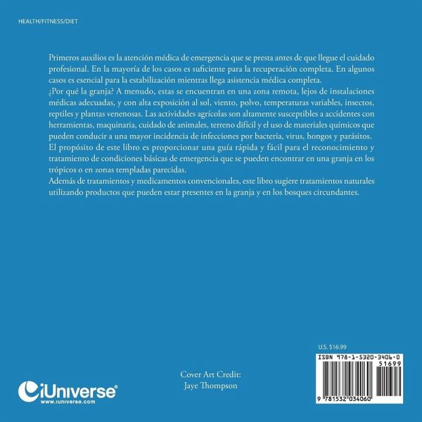 Primeros auxilios es la atención médica de emergencia que se presta antes de que llegue el cuidado profesional. En la mayoría de los casos es suficiente para la recuperación completa. En algunos casos es esencial para la estabilización mientras llega asistencia médica completa. ¿Por qué la granja? A menudo, estas se encuentran en una zona remota, lejos de instalaciones médicas adecuadas, y con alta exposición al sol, viento, polvo, temperaturas variables, insectos, reptiles y plantas venenosas. Las actividades agrícolas son altamente susceptibles a accidentes con herramientas, maquinaria, cuidado de animales, terreno difícil y el uso de materiales químicos que pueden conducir a una mayor incidencia de infecciones por bacteria, virus, hongos y parásitos. El propósito de este libro es proporcionar una guía rápida y fácil para el reconocimiento y tratamiento de condiciones básicas de emergencia que se pueden encontrar en una granja en los trópicos o en zonas templadas parecidas. Además de tratamientos y medicamentos convencionales, este libro sugiere tratamientos naturales utilizando productos que pueden estar presentes en la granja y en los bosques circundantes.