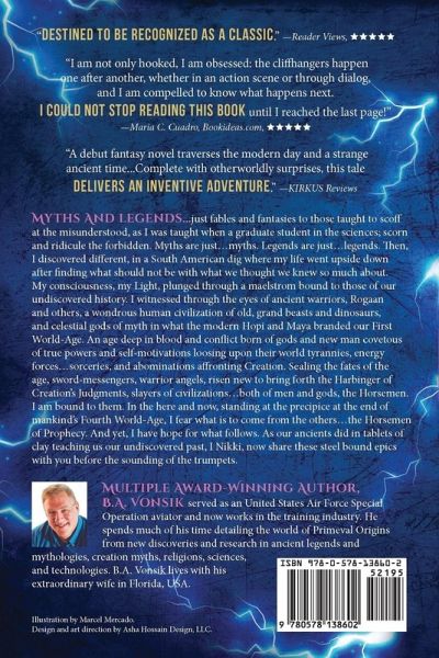 An Epic Tale of the Origins of Mankind’s Eternal War Between Good and Evil 2015 READER VIEWS REVIEWERS FIRST PLACE CHOICE AWARD Winner - 2014/2015 Young Adult Book of the Year, Reader Views Literary Awards Finalist - 2016 Fantasy Book of Year, International Book Awards Finalist - 2016 Fantasy Book of the Year, Reader Favorites Book Awards Distinguished Favorite - 2017 Fantasy Book of the Year, Independent Press Awards Winner - 2017 Fantasy Book of the Year, NYC Big Book Award Readers Favorite - 5-Stars! Good Reads - 5 Stars! Tomb Tender - 5 Stars! Bookideas - 5 Stars! Multiple Award-Winning Primeval Origins: Paths of Anguish (2nd Edition) is the first book of the epic origins story of mankind, our heavenly hosts, and the eternal war between good and evil where all is revealed, through characters both past and present, and tellings of humanity's heroic struggles against terrible tyrannies, deadly dinosaurs, and ancient gods as the origins of our End Times is revealed, answering the question, "What if all of our myths and legends are true?" Myths and Legends...just fables and fantasies for those taught to scoff at them is understood, as I was taught when a graduate student in the sciences; scorn and ridicule the forbidden. Myths are just...myths. Legends are just...legends. Then, I discovered different, in a South American dig where my life went upside down after finding what should not be with what we thought we knew so much about. My consciousness, my Light, plunged through a maelstrom bound to those of our undiscovered history. I witnessed through the eyes of ancient warriors, Rogaan and others, a wondrous human civilization of old, grand beasts and dinosaurs, and celestial gods of myth in what the modern Hopi and Maya branded our First World-Age. An age deep in blood and conflict born of gods and new man covetous of true powers and self-motivations loosing upon their world tyrannies, energy forces...sorceries, and abominations affronting Creation. Sealing the fates of the age, sword-messengers, warrior angels, risen new to bring forth the Harbinger of Creation's Judgments, slayers of civilizations...both of men and gods, the Horsemen. I am bound to them. In the here and now, standing at the precipice at the end of mankind's Fourth World-Age, I fear what is to come from the others...the Horsemen of Prophecy. And yet, I have hope for what follows. As our ancients did in tablets of clay teaching us our undiscovered past, I Nikki, now share these steel bound epics with you before the sounding of the trumpets. Visit the Primeval Origins websites at: celestialfurypublishing.com, primevalorigins.com, facebook.com/primevalorigins. The websites are loaded with news, the Primeval Origins Encyclopedia and Lexicon (all the background elements that you just can't stuff into the books).