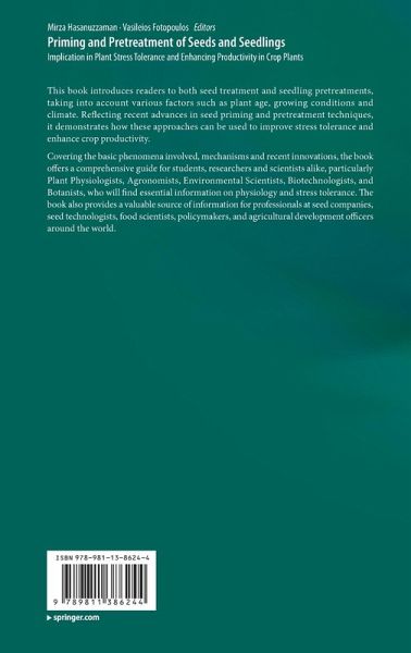 Chapter 1: Methods of Seed Priming.- Chapter 2: Advances in the Concept and Methods of Seed Priming.- Chapter 3: Physiological, Biochemical and Molecular Aspects of Seed Priming.- Chapter 4: The Physiological, Biochemical and Molecular Basis of Seed Priming.- Chapter 5: Seedling Pretreatment: Methods and Protocols.- Chapter 6: Effect of the Seed Priming on Seed Dormancy and Vigor.- Chapter 7: Alteration in Plant Secondary Metabolism by Seed Priming.- Chapter 8: Seed Priming-Induced Early Vigor in Crops: An Alternate Strategy for Abiotic Stress Tolerance.- Chapter 9: Seed Priming Alleviates Stress Tolerance in Rice (Oryza sativa L.).- Chapter 10: Seed Priming and Salt Stress Tolerance in Plants.- Chapter 11: Seed Priming-Mediated Improvement of Plant Morphophysiology Under Salt Stress.- Chapter 12: The Mechanisms of Seed Priming Proposed for Enhancing Plant Tolerance Under Salt Stress.- Chapter 13: Seed Priming and PretreatmentInduced Enhanced Tolerance To Drought and Salt Stress: Recent Advances.- Chapter 14: Seed Priming to Enhance Chilling Tolerance in Field Crops: An Overview.- Chapter 15: Seed Priming and Metal/metalloid Stress Tolerance in Plants.- Chapter 16: Advances in Heavy Metal Induced Stress Alleviation With Respect to Exogenous Amendments in Crop Plants.- Chapter 17: Seed Priming for Disease Tolerance in Plants.- Chapter 18: Seed Pretreatment for Pathogen Control.- Chapter 19: Hydropriming for Plant Growth and Stress Tolerance.- Chapter 20: Chemical Priming for Multiple Stress Tolerance.- Chapter 21: Abiotic Stress Tolerance in Plants by Priming and Pretreatment with Hydrogen peroxide.- Chapter 22: Abiotic Stress Tolerance in Plants Through Pre-Sowing Seed Treatments with Mineral Elements and Growth Regulators.- Chapter 23: Abiotic Stress Tolerance in Plants by Priming and Pretreatments with Phytohormones.- Chapter 24: Abiotic Stress Tolerance in Plants by Priming and Pretreatments with Ascorbic Acid.- Chapter 25: An Assessment of Efficiency of Zinc Priming on as Induced Phytotoxicity in Rice During Germination and Early Seedling Growth.- Chapter 26: Application of Endophytes through Seed Priming.- Chapter 27: Microbial Inoculation of Seeds for Better Plant Growth and Productivity.- Chapter 28: Role of Seed Priming and Plant Growth Promoting Rhizobacteria in Modulating Crops' Responses to Salinity Stress.- Chapter 29: Pretreatment of Seedlings with Exogenous Protectants for Abiotic Stress Tolerance.- Chapter 30: Improving Antioxidant Defense in Plants through Seed Priming and Seedling Pretreatment.