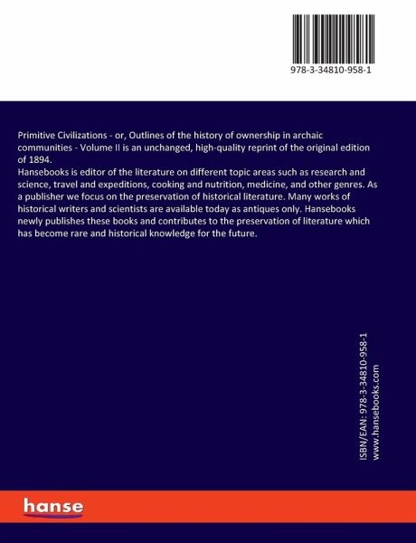 Primitive Civilizations - or, Outlines of the history of ownership in archaic communities - Volume II is an unchanged, high-quality reprint of the original edition of 1894.Hansebooks is editor of the literature on different topic areas such as research and science, travel and expeditions, cooking and nutrition, medicine, and other genres. As a publisher we focus on the preservation of historical literature. Many works of historical writers and scientists are available today as antiques only. Hansebooks newly publishes these books and contributes to the preservation of literature which has become rare and historical knowledge for the future.