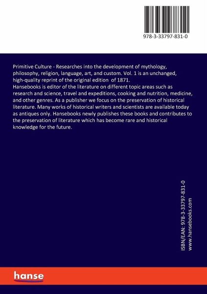 Primitive Culture - Researches into the development of mythology, philosophy, religion, language, art, and custom. Vol. 1 is an unchanged, high-quality reprint of the original edition of 1871. Hansebooks is editor of the literature on different topic areas such as research and science, travel and expeditions, cooking and nutrition, medicine, and other genres. As a publisher we focus on the preservation of historical literature. Many works of historical writers and scientists are available today as antiques only. Hansebooks newly publishes these books and contributes to the preservation of literature which has become rare and historical knowledge for the future.