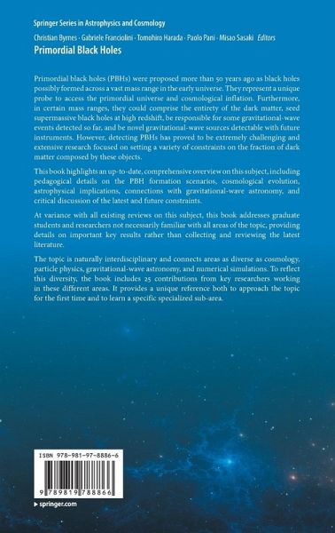 This book highlights an up-to-date, comprehensive overview on this subject, including pedagogical details on the PBH formation scenarios, cosmological evolution, astrophysical implications, connections with gravitational-wave astronomy, and critical discussion of thelatest and future constraints.