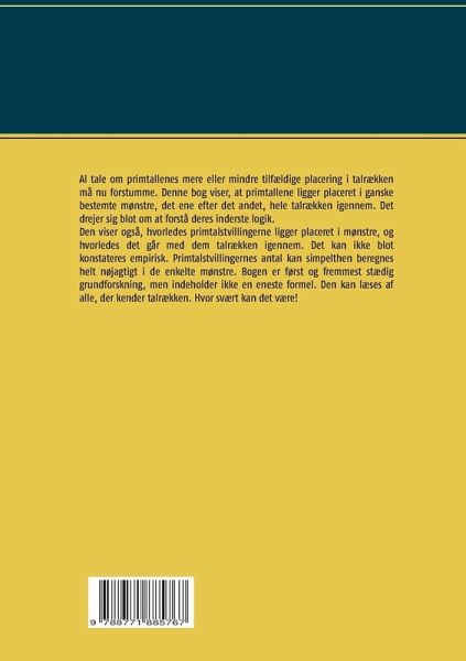 Al tale om primtallenes mere eller mindre tilfældige placering i talrækken må nu forstumme. Denne bog viser, at primtallene ligger placeret i ganske bestemte mønstre, det ene efter det andet, hele talrækken igennem. Det drejer sig blot om at forstå deres inderste logik. Den viser også, hvorledes primtalstvillingerne ligger placeret i mønstre, og hvorledes det går med dem talrækken igennem. Det kan ikke blot konstateres empirisk. Primtalstvillingernes antal kan simpelthen beregnes helt nøjagtigt i de enkelte mønstre. Bogen er først og fremmest grundforskning, men indeholder ikke en eneste formel. Den kan læses af alle, der kender talrækken. Hvor svært kan det være! Bogen har et fyldigt resume på engelsk.