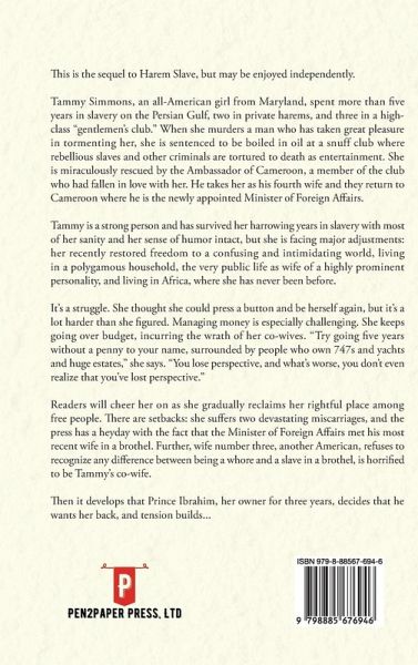 This is the sequel to Harem Slave, but may be enjoyed independently. Tammy Simmons, an all-American girl from Maryland, spent more than five years in slavery on the Persian Gulf, two in private harems, and three in a high-class "gentlemen's club." When she murders a man who has taken great pleasure in tormenting her, she is sentenced to be boiled in oil at a snuff club where rebellious slaves and other criminals are tortured to death as entertainment. She is miraculously rescued by the Ambassador of Cameroon, a member of the club who had fallen in love with her. He takes her as his fourth wife and they return to Cameroon where he is the newly appointed Minister of Foreign Affairs. Tammy is a strong person and has survived her harrowing years in slavery with most of her sanity and her sense of humor intact, but she is facing major adjustments: her recently restored freedom to a confusing and intimidating world, living in a polygamous household, the very public life as wife of a highly prominent personality, and living in Africa, where she has never been before. It's a struggle. She thought she could press a button and be herself again, but it's a lot harder than she figured. Managing money is especially challenging. She keeps going over budget, incurring the wrath of her co-wives. "Try going five years without a penny to your name, surrounded by people who own 747s and yachts and huge estates," she says. "You lose perspective, and what's worse, you don't even realize that you've lost perspective." Readers will cheer her on as she gradually reclaims her rightful place among free people. There are setbacks: she suffers two devastating miscarriages, and the press has a heyday with the fact that the Minister of Foreign Affairs met his most recent wife in a brothel. Further, wife number three, another American, refuses to recognize any difference between being a whore and a slave in a brothel, is horrified to be Tammy's co-wife. Then it develops that Prince Ibrahim, her owner for three years, decides that he wants her back, and tension builds...