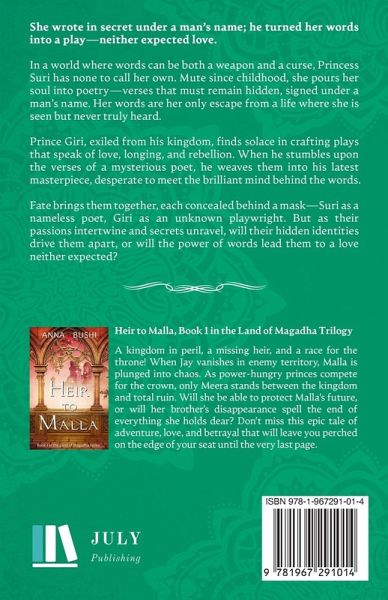 She wrote in secret under a man's name; he turned her words into a play-neither expected love. In a world where words can be both a weapon and a curse, Princess Suri has none to call her own. Mute since childhood, she pours her soul into poetry-verses that must remain hidden, signed under a man's name. Her words are her only escape from a life where she is seen but never truly heard. Prince Giri, exiled from his kingdom, finds solace in crafting plays that speak of love, longing, and rebellion. When he stumbles upon the verses of a mysterious poet, he weaves them into his latest masterpiece, desperate to meet the brilliant mind behind the words. Fate brings them together, each concealed behind a mask-Suri as a nameless poet, Giri as an unknown playwright. But as their passions intertwine and secrets unravel, will their hidden identities drive them apart, or will the power of words lead them to a love neither expected?