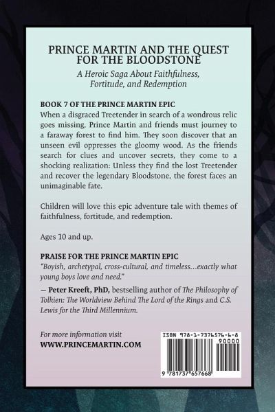 Rich grayscale art edition! Looking for the premium color edition? Search ISBN 9781737657675 Read this action-packed saga as a stand-alone story or as part of the Prince Martin Epic series. When a disgraced Treetender in search of a wondrous relic goes missing, Prince Martin and friends must journey to a faraway forest to find him. They soon discover that an unseen evil oppresses the gloomy wood. As the friends search for clues and uncover secrets, they come to a shocking realization: Unless they find the lost Treetender and recover the legendary Bloodstone, the forest faces an unimaginable fate. Children will love this epic adventure tale with themes of faithfulness, loyalty, and redemption. Ages 10 and up. Praise for the Prince Martin Epic: "Boyish, archetypal, cross-cultural, and timeless...exactly what young boys love and need." - Peter Kreeft, PhD, bestselling author of The Philosophy of Tolkien: The Worldview Behind The Lord of the Rings and C.S. Lewis for the Third Millennium Books in the Prince Martin Epic chapter books series. Each tale can be read in order or as a stand-alone: ¿ Prince Martin Wins His Sword ¿ Prince Martin and the Thieves ¿ Prince Martin and the Dragons ¿ Prince Martin and the Cave Bear ¿ Prince Martin and the Last Centaur ¿ Prince Martin and the Pirates ¿¿¿ Prince Martin and the Quest for the Bloodstone