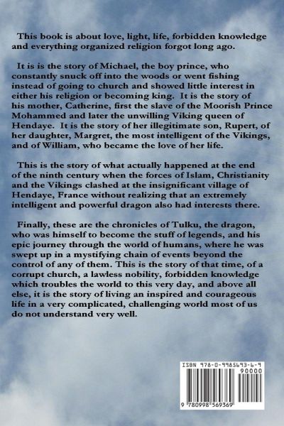 This book is about love, light, life, forbidden knowledge and everything churchianity and organized religion forgot about long ago. It is the story of Michael, the boy prince, who constantly snuck off into the woods or went fishing instead of going to church and showed little interest in either his religion or becoming king. It is the story of his mother, Catherine, first the slave of the Moorish Prince Mohammed and later the unwilling Viking queen of Hendaye. It is the story of her illegitimate son Rupert, of her daughter Margret, the most intelligent of the Vikings, and of William, who became the love of her life. This is the story of what actually happened at the end of the ninth century when the forces of Islam, Christianity and the Vikings clashed at the insignificant village of Hendaye, France without realizing that an extremely intelligent and powerful dragon also had interests there. Finally, these are the chronicles of Tulku, the dragon, who was himself to become the stuff of legends, and his epic journey through the world of humans, where he was swept up in a mystifying chain of events beyond the control of any of them. This is the story of that time, of a corrupt church, a lawless nobility, forbidden knowledge which troubles the world to this very day, and above all else, it is the story of living an inspired and courageous life in a very complicated, challenging world most of us do not understand very well.