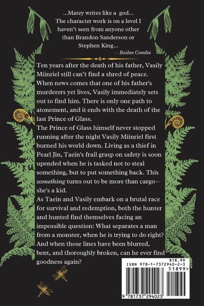 Ten years after the death of his father, Vasily still can't find a shred of peace. When news comes that a perpetrator of his father's murder survived, Vasily must resurrect the grudge that controls his life. There is only one path to atonement, and it ends with the death of the last Prince of Glass. The Prince of Glass himself never stopped running after the night Vasily burned his world down. Living as a thief under the protection of the biggest mob boss in Pearl Jin, Taein's frail grasp on safety is upended when he is tasked not to steal something, but to put something back. But this something happens to be more than cargo-- she's a kid. As Taein and Vasily embark on a brutal race for survival and redemption, both the hunter and hunted find themselves facing an impossible question: What separates a man from a monster, when he is trying to do right? And when those lines have been blurred, bent, and thoroughly broken, can he ever find goodness again? PRAISE FOR PRINCE OF GLASS: REMASTERED "When I tell you Matey writes like a god, I mean she writes like a GOD... This is an epic fantasy you just can't miss. The character work in this book is on a level I haven't seen from anyone other than Brandon Sanderson and Stephen King." Bailee Condie "Prince of Glass is a hauntingly poignant, epic tale that you won't be able to get out of your head... Moving, gripping, and unforgettable. A. M. Libby "Captivating, compelling, stylish." T. R. Ringnalda "Packed with raw emotion, Prince of Glass is a deeply moving journey... This story will captivate audiences looking for an edge of your seat, give you the chills, jaw-dropping, heartwarming rollercoaster of an adventure." M. R. Oswalt "A harrowing, hauntingly beautiful, and poignant epic journey... this is a book you can't miss if you love gritty, grimdark fantasy or masterfully written morally grey antiheroes. This gripping tale will stay with you in the corners of your mind long after you turn the last page." Marta Tori¿ CONTENT WARNINGS for strong violence, profanity, and heavy drug use.