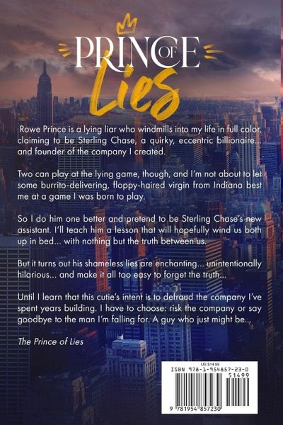Rowe Prince is a lying liar who windmills into my life in full color, claiming to be Sterling Chase, a quirky, eccentric billionaire... and founder of the company I created. Two can play at the lying game, though, and I'm not about to let some burrito-delivering, floppy-haired virgin from Indiana best me at a game I was born to play. So I do him one better and pretend to be Sterling Chase's new assistant. I'll teach him a lesson that will hopefully wind us both up in bed... with nothing but the truth between us. But it turns out his shameless lies are enchanting... unintentionally hilarious... and make it all too easy to forget the truth... Until I learn that this cutie's intent is to defraud the company I've spent years building. I have to choose: risk the company or say goodbye to the man I'm falling for. A guy who just might be... The Prince of Lies