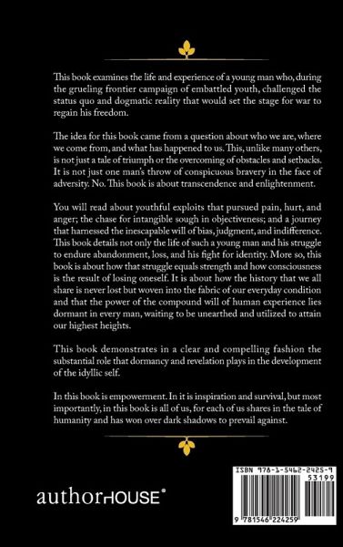 This book examines the life and experience of a young man who, during the grueling frontier campaign of embattled youth, challenged the status quo and dogmatic reality that would set the stage for war to regain his freedom. The idea for this book came from a question about who we are, where we come from, and what has happened to us. This, unlike many others, is not just a tale of triumph or the overcoming of obstacles and setbacks. It is not just one man?s throw of conspicuous bravery in the face of adversity. No. This book is about transcendence and enlightenment. You will read about youthful exploits that pursued pain, hurt, and anger; the chase for intangible sough in objectiveness; and a journey that harnessed the inescapable will of bias, judgment, and indifference. This book details not only the life of such a young man and his struggle to endure abandonment, loss, and his fight for identity. More so, this book is about how that struggle equals strength and how consciousness is the result of losing oneself. It is about how the history that we all share is never lost but woven into the fabric of our everyday condition and that the power of the compound will of human experience lies dormant in every man, waiting to be unearthed and utilized to attain our highest heights. This book demonstrates in a clear and compelling fashion the substantial role that dormancy and revelation plays in the development of the idyllic self. In this book is empowerment. In it is inspiration and survival, but most importantly, in this book is all of us, for each of us shares in the tale of humanity and has won over dark shadows to prevail against.