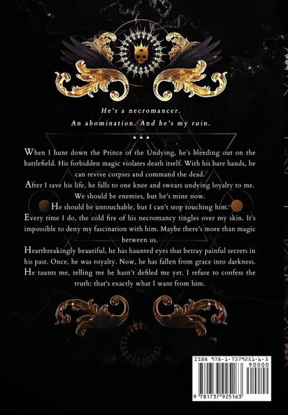 His touch awakens the dead. My touch awakens his soul. When I track down the Prince of the Undying on a blood-soaked battlefield, I find him moments from death-a necromancer whose forbidden magic violates the very laws of mortality. With a single touch, he can raise corpses and command the dead. I save his life, never expecting him to kneel before me and pledge his undying loyalty. We should be sworn enemies. Instead, he vows to become my greatest protector. I don't know if I'm strong enough to refuse him. He's heartbreakingly beautiful, and yet his haunted eyes betray unspeakable trauma. Once a Prince of Prussia, now he walks in shadows, fallen from grace into the darkest corners of magic. He should be forbidden. Yet I can't keep my hands off him. Each time our skin meets, his necromancy ripples through me like cold fire, thrilling me. There's more than just dark magic between us-there's something dangerously close to desire. Prince of the Undying is perfect for fans of dark fantasy romance, morally gray heroes who are beautifully broken, and spice that burns hotter than hellfire.