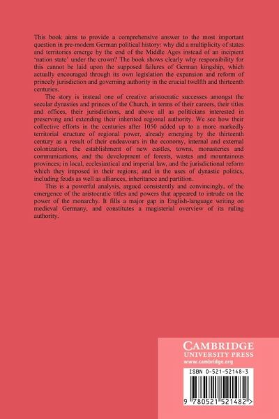 This book addresses the most important question in pre-modern German political history: why did a multiplicity of states and territories emerge by the end of the Middle Ages instead of an incipient 'nation state' under the crown? The answer is found not in the supposed failures of German kingship, but instead in the creative aristocratic successes of the secular dynasties and princes of the Church. We see how their collective efforts in the centuries after 1050 added up to a more markedly territorial structure of regional power, already emerging by the thirteenth century as a result of their endeavours in the economy, internal and external colonization, and the establishment of new castles, towns, monasteries and communications; in local, ecclesiastical and imperial law, and the jurisdictional reform which they imposed in their regions; and in the uses of dynastic politics, including feuds as well as alliances, inheritance and partition.