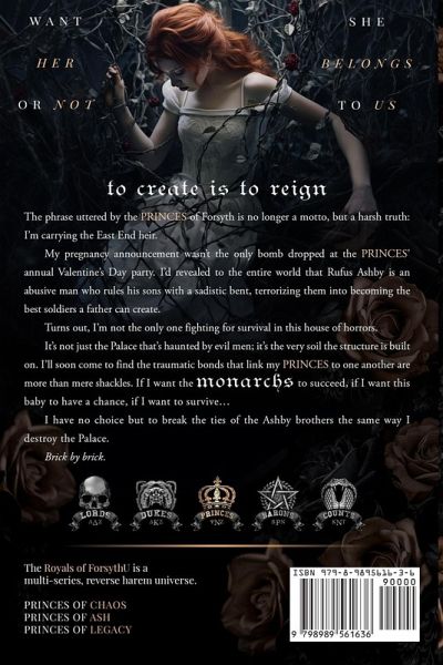 "To create is to reign." The phrase uttered by the Princes of Forsyth is no longer a motto, but a harsh truth: I'm carrying the East End heir. My pregnancy announcement wasn't the only bomb dropped at the Princes' annual Valentine's Day party. I'd revealed to the entire world that Rufus Ashby is an abusive man who rules his sons with a sadistic bent, terrorizing them into becoming the best soldiers a father can create. Turns out, I'm not the only one fighting for survival in this house of horrors. Whitaker- He's beautiful and broken, and though my betrayal of him may be my biggest regret, he makes it difficult to feel guilty. Pace- The same paranoia which makes him viciously cling to the things he loves also drives him to lock them away. Lex- His brilliance is matched only by his loyalty, but there's two sides to the man who wanders into my room at night. It's not just the Palace that's haunted by evil men; it's the very soil the structure is built on. I'll soon come to find the traumatic bonds that link my Princes to one another are more than mere shackles. If I want the Monarchs to succeed, if I want this baby to have a chance, if I want to survive... I have no choice but to break the ties of the Ashby brothers the same way I destroy the Palace. Brick by brick. Princes of Ash is book 8 in the contemporary, dark, reverse harem, traumatic romance, Royals of Forsyth U series by best-selling authors, Angel Lawson and Samantha Rue. Please read the foreword for all content warnings and details.