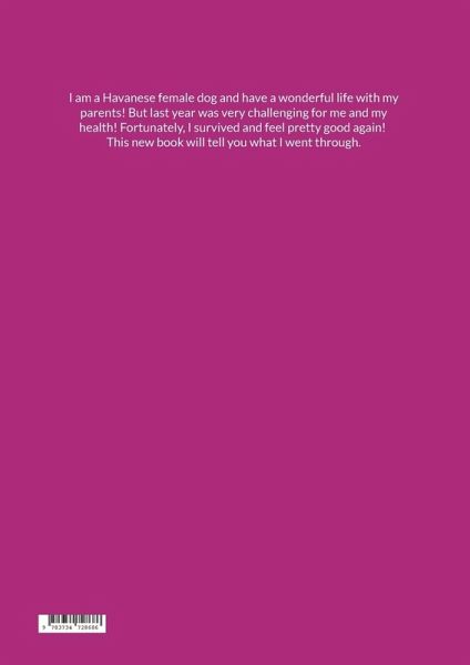 I am a Havanese female dog and have a wonderful life with my parents! But last year was very challenging for me and my health! Fortunately, I survived and feel pretty good again! This new book will tell you what I went through.