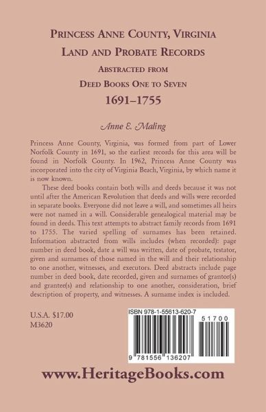 Princess Anne County, Virginia, was formed from part of Lower Norfolk County in 1691, so the earliest records for this area will be found in Norfolk County. In 1962, Princess Anne County was incorporated into the city of Virginia Beach, Virginia, by which name it is now known. These deed books contain both wills and deeds because it was not until after the American Revolution that deeds and wills were recorded in separate books. Everyone did not leave a will, and sometimes all heirs were not named in a will. Considerable genealogical material may be found in deeds. This text attempts to abstract family records from 1691 to 1755. The varied spelling of surnames has been retained. Information abstracted from wills includes (when recorded): page number in deed book, date a will was written, date of probate, testator, given and surnames of those named in the will and their relationship to one another, witnesses, and executors. Deed abstracts include page number in deed book, date recorded, given and surnames of grantor(s) and grantee(s) and relationship to one another, consideration, brief description of property, and witnesses. A surname index is included.