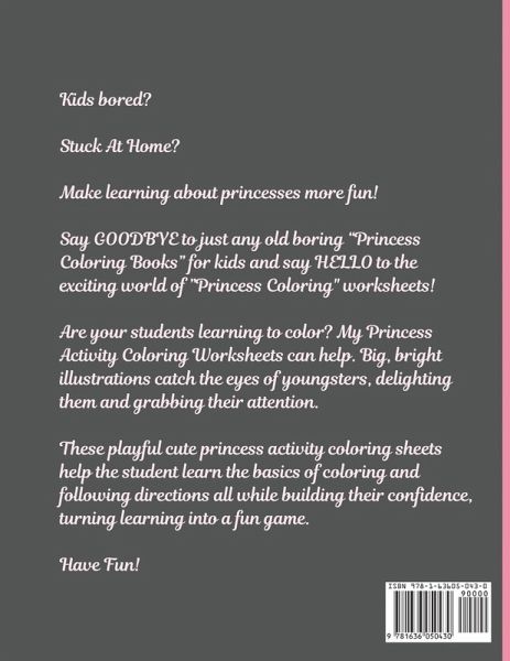 Kids bored? Stuck at home? Make learning about princesses more fun! Say GOODBYE to just any old boring "Princess Coloring Books" for kids and say HELLO to the exciting world of "Princess Coloring" worksheets! Are your students learning to color? My Princess Activity Coloring Worksheets can help. Big, bright illustrations catch the eyes of youngsters, delighting them and grabbing their attention. These playful cute princess activity coloring sheets help the student learn the basics of coloring and following directions all while building their confidence, turning learning into a fun game. Have Fun!