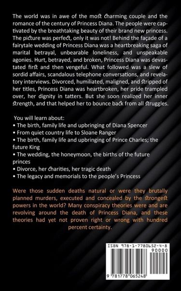 The world was in awe of the most charming couple and the romance of the century of Princess Diana. The people were captivated by the breathtaking beauty of their brand new princess. The picture was perfect, only it was not! Behind the façade of a fairytale wedding of Princess Diana was a heartbreaking saga of marital betrayal, unbearable loneliness, and unspeakable agonies. Hurt, betrayed, and broken, Princess Diana was devastated first and then vengeful. What followed was a slew of sordid affairs, scandalous telephone conversations, and revelatory interviews. Divorced, humiliated, maligned, and stripped of her titles, Princess Diana was heartbroken, her pride trampled over, her dignity in tatters. But she soon realized her inner strength, and that helped her to bounce back from all struggles. You will learn about:The birth, family life and upbringing of Diana Spencer From quiet country life to Sloane Ranger The birth, family life and upbringing of Prince Charles; the future King The wedding, the honeymoon, the births of the future princes Divorce, her charities, her tragic death The legacy and memorials to the people's Princess Were those sudden deaths natural or were they brutally planned murders, executed and concealed by the strongest powers in the world? Many conspiracy theories were and are revolving around the death of Princess Diana, and these theories had yet not proven right or wrong with hundred percent certainty.