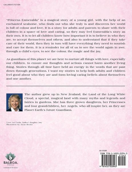 "Princess Esmeralda" is a magical story of a young girl, with the help of an enchanted seahorse, who finds out who she truly is and discovers her world is full of colour and love. It is a story for adults and parents to share with their children in a space of love and caring, so they may feel Esmeralda's story as their own. It is to let all children know how important it is to believe in who they are, to accept themselves and others, and also to understand that if they take care of their world, then they in turn will have everything they need to nourish and care for them. It is a reminder for all of us to see the world again in awe, through a child's eyes, to see the colour, the magic and the joy. As guardians of this planet we are here to nurture all things with love, especially our children, to ensure our thoughts and actions cannot harm another living thing. Stories through all time have held an energy in the words that are passed down through generations. I want my stories to help both adults and children feel good about who they are and form loving caring beliefs about themselves and one another.