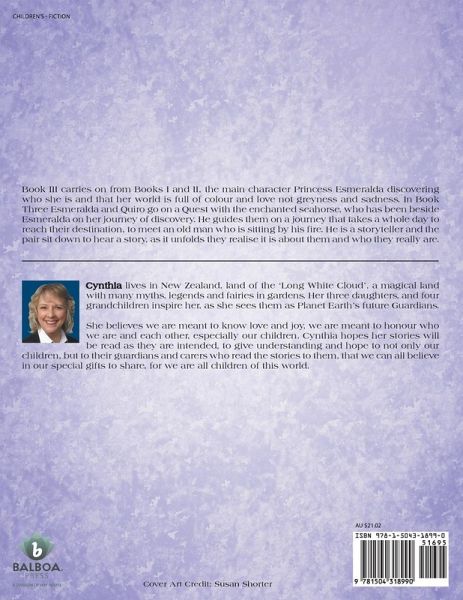 Book III carries on from Books I and II, the main character Princess Esmeralda discovering who she is and that her world is full of colour and love not greyness and sadness. In Book Three Esmeralda and Quiro go on a Quest with the enchanted seahorse, who has been beside Esmeralda on her journey of discovery. He guides them on a journey that takes a whole day to reach their destination, to meet an old man who is sitting by his fire. He is a storyteller and the pair sit down to hear a story, as it unfolds they realise it is about them and who they really are.