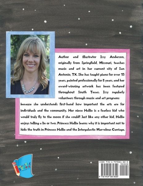 In Princess Hallie and the Intergalactic Marvelous Carriage, Princess Hallie sneaks off and takes her own adventure in the Marvelous Carriage. While visiting her alien friend Penelope on the moon, the girls decide to both come back to Earth. With Penelope secretly on Earth, all kinds of crazy things start happening around Princess Hallie and her family! Princess Hallie speaks up and learns the importance of telling the truth. Author and illustrator Izzy Anderson, originally from Springfield, Missouri, teaches music and art in her current city of San Antonio, TX. She has taught piano for over 15 years, painted professionally for 8 years, and her award-winning artwork has been featured throughout South Texas. Izzy regularly volunteers through music and art programs because she understands first-hand how important the arts are for individuals and the community. Her niece Hallie is a fearless kid who would truly fly to the moon if she could! Just like any other kid, Hallie enjoys telling a lie or two. Princess Hallie learns why it is important not to hide the truth in Princess Hallie and the Intergalactic Marvelous Carriage.