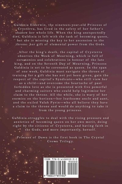 Galdinia Elderwin, the nineteen-year-old Princess of Crysterra, has lived in the safety of her father's shadow her whole life. When the king unexpectedly dies, Galdinia is left with the task of becoming queen, but she is missing the key to her ascension to the throne: her gift of elemental power from the Gods. After the king's death, the capital of Crysterra observes the Week of Mourning, which is full of ceremonies and celebrations in honour of the late king, and on the Seventh Day of Mourning, Princess Galdinia is set to be coronated as queen. In the span of one week, Galdinia must navigate the throes of training for a gift she has not yet been given, gain the respect of the capital's Syndicate-who still view her as a child-and overcome the heartache of past forbidden love as she is presented with five powerful and charming suitors who could help legitimise her claim to the throne. All the while, she is wary of her enemies on the horizon-her loathsome uncle and aunt, and the exiled Valah Pyrin-who all believe they have a claim to the throne and would do anything to take it from the young princess. Galdinia struggles to deal with the rising pressure and anxieties of becoming queen on her own merit, doing right by the citizens of Crysterra, and having faith in the Gods, and more importantly, herself. Princess of Dawn is the first book in The Crystal Crown Trilogy. With its fast-paced story and expansive world, Princess of Dawn is perfect for fans of Leigh Bardugo and Victoria Aveyard.