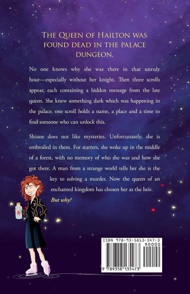 The Queen of Hailton was found dead in the palace dungeon. No one knows why she was there in that unruly hour- especially without her knight. Then three scrolls appear, each containing a hidden message from the last queen. She knew something dark which was happening in the palace. One scroll holds a name, a place and a time to find someone who can unlock this. Shiane does not like mysteries. Unfortunately, she is embroiled in them. For starters, she woke up in the middle of a forest, with no memory of who she was and how she got there. A man from a strange world tells her she is the key to solving a murder. Now the queen of an enchanted kingdom has chosen her as the heir. With time running out and danger at every turn, Shiane must decipher the messages in the scrolls and confront the forces that threaten to tear the kingdom apart. But as she uncovers the truth about her identity and her connection to the murdered queen, Shiane realizes that the fate of the kingdom is not the only thing that hangs in the balance... Perfect for fans of the Harry Potter series and Nevermoor, this story takes readers into a magical kingdom, enticing the mind with mystery and adventure.