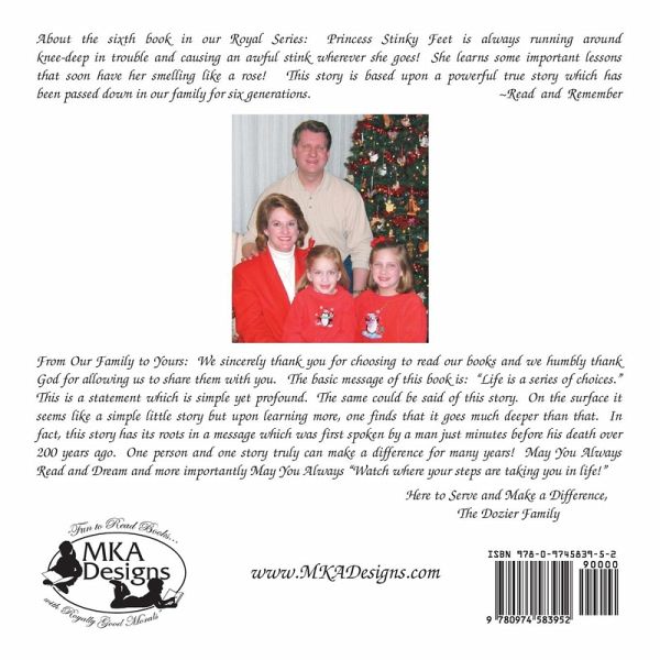 Princess Stinky Feet is always running around knee-deep in trouble and causing an awful stink wherever she goes! She learns some important lessons that soon have her smelling like a rose! This story is based upon a powerful true story which has been passed down in our family for six generations.