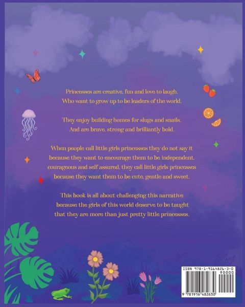 Princesses are creative, fun and love to laugh Who want to grow up to be leaders of the world They enjoy building homes for slugs and snails And are brave, strong and brilliantly bold When people call little girls princesses they do not say it because they want to encourage them to be independent, courageous and self assured, they call little girls princesses because they expect them to be sweet and fluffy. This book is all about challenging this narrative because the girls of this world deserve to be taught that they are more than just pretty little princesses.