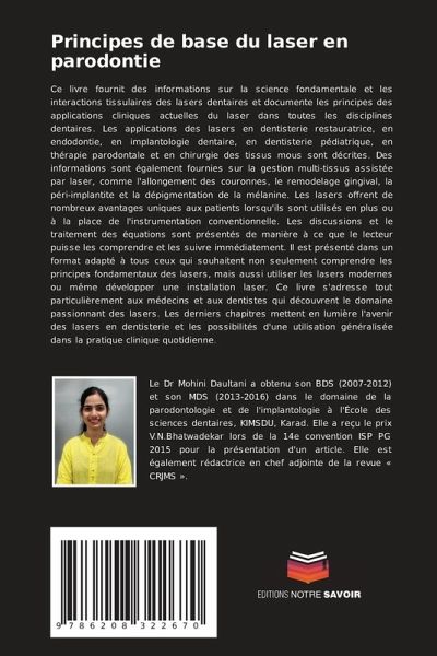 Ce livre fournit des informations sur la science fondamentale et les interactions tissulaires des lasers dentaires et documente les principes des applications cliniques actuelles du laser dans toutes les disciplines dentaires. Les applications des lasers en dentisterie restauratrice, en endodontie, en implantologie dentaire, en dentisterie pédiatrique, en thérapie parodontale et en chirurgie des tissus mous sont décrites. Des informations sont également fournies sur la gestion multi-tissus assistée par laser, comme l'allongement des couronnes, le remodelage gingival, la péri-implantite et la dépigmentation de la mélanine. Les lasers offrent de nombreux avantages uniques aux patients lorsqu'ils sont utilisés en plus ou à la place de l'instrumentation conventionnelle. Les discussions et le traitement des équations sont présentés de manière à ce que le lecteur puisse les comprendre et les suivre immédiatement. Il est présenté dans un format adapté à tous ceux qui souhaitent non seulement comprendre les principes fondamentaux des lasers, mais aussi utiliser les lasers modernes ou même développer une installation laser. Ce livre s'adresse tout particulièrement aux médecins et aux dentistes qui découvrent le domaine passionnant des lasers. Les derniers chapitres mettent en lumière l'avenir des lasers en dentisterie et les possibilités d'une utilisation généralisée dans la pratique clinique quotidienne.