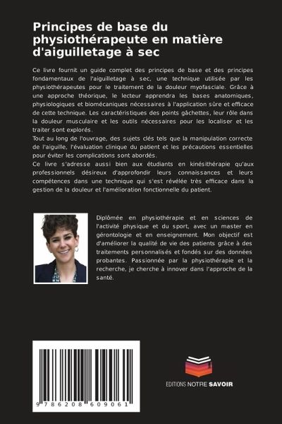 Ce livre fournit un guide complet des principes de base et des principes fondamentaux de l'aiguilletage à sec, une technique utilisée par les physiothérapeutes pour le traitement de la douleur myofasciale. Grâce à une approche théorique, le lecteur apprendra les bases anatomiques, physiologiques et biomécaniques nécessaires à l'application sûre et efficace de cette technique. Les caractéristiques des points gâchettes, leur rôle dans la douleur musculaire et les outils nécessaires pour les localiser et les traiter sont explorés.Tout au long de l'ouvrage, des sujets clés tels que la manipulation correcte de l'aiguille, l'évaluation clinique du patient et les précautions essentielles pour éviter les complications sont abordés.Ce livre s'adresse aussi bien aux étudiants en kinésithérapie qu'aux professionnels désireux d'approfondir leurs connaissances et leurs compétences dans une technique qui s'est révélée très efficace dans la gestion de la douleur et l'amélioration fonctionnelle du patient.