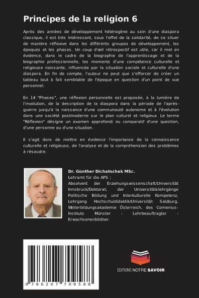 Après des années de développement hétérogène au sein d'une diaspora classique, il est très intéressant, sous l'effet de la solidarité, de se situer de manière réflexive dans les différents groupes de développement, les époques et les phases. Un coup d'oeil rétrospectif est utile, car il met en évidence, dans le cadre de la biographie de l'apprentissage et de la biographie professionnelle, les moments d'une compétence culturelle et religieuse naissante, influencée par la situation sociale et culturelle d'une diaspora. En fin de compte, l'auteur ne peut que s'efforcer de créer un tableau tout à fait semblable de l'époque en question d'un point de vue personnel. En 14 "Phases", une réflexion personnelle est proposée, à la lumière de l'involution, de la description de la diaspora dans la période de l'après-guerre jusqu'à la naissance d'une communauté autonome et à l'évolution dans une société postmoderne sur le plan culturel et religieux. Le terme "Réflexion" désigne un examen approfondi ou comparatif d'une question, d'une personne ou d'une situation. Il s'agit donc de mettre en évidence l'importance de la connaissance culturelle et religieuse, de l'analyse et de la compréhension des problèmes à résoudre.