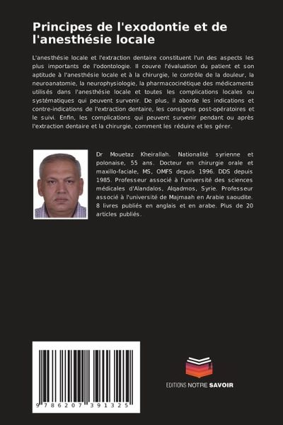 L'anesthésie locale et l'extraction dentaire constituent l'un des aspects les plus importants de l'odontologie. Il couvre l'évaluation du patient et son aptitude à l'anesthésie locale et à la chirurgie, le contrôle de la douleur, la neuroanatomie, la neurophysiologie, la pharmacocinétique des médicaments utilisés dans l'anesthésie locale et toutes les complications locales ou systématiques qui peuvent survenir. De plus, il aborde les indications et contre-indications de l'extraction dentaire, les consignes post-opératoires et le suivi. Enfin, les complications qui peuvent survenir pendant ou après l'extraction dentaire et la chirurgie, comment les réduire et les gérer.