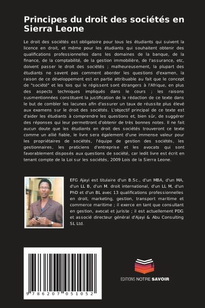Le droit des sociétés est obligatoire pour tous les étudiants qui suivent la licence en droit, et même pour les étudiants qui souhaitent obtenir des qualifications professionnelles dans les domaines de la banque, de la finance, de la comptabilité, de la gestion immobilière, de l'assurance, etc, doivent passer le droit des sociétés ; malheureusement, la plupart des étudiants ne savent pas comment aborder les questions d'examen, la raison de ce développement est en partie attribuable au fait que le concept de "société" et les lois qui le régissent sont étrangers à l'Afrique, en plus des aspects techniques impliqués dans le cours ; les raisons susmentionnées constituent la justification de la rédaction de ce texte dans le but de combler les lacunes afin d'assurer un taux de réussite plus élevé aux examens sur le droit des sociétés. L'objectif principal de ce texte est d'aider les étudiants à comprendre les questions et, bien sûr, de suggérer des réponses qui leur permettront d'obtenir de très bonnes notes. Il ne fait aucun doute que les étudiants en droit des sociétés trouveront ce texte comme un allié fiable, le livre sera également d'une immense valeur pour les propriétaires de sociétés, l'équipe de gestion des sociétés, les gestionnaires, les praticiens d'entreprise et les avocats qui sont favorablement disposés aux questions de société, car ledit livre est écrit en tenant compte de la Loi sur les sociétés, 2009 Lois de la Sierra Leone.