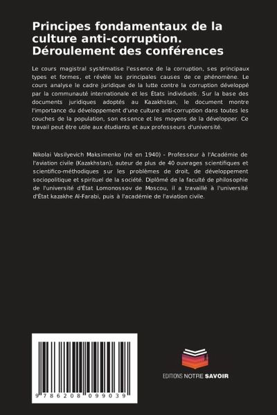 Le cours magistral systématise l'essence de la corruption, ses principaux types et formes, et révèle les principales causes de ce phénomène. Le cours analyse le cadre juridique de la lutte contre la corruption développé par la communauté internationale et les États individuels. Sur la base des documents juridiques adoptés au Kazakhstan, le document montre l'importance du développement d'une culture anti-corruption dans toutes les couches de la population, son essence et les moyens de la développer. Ce travail peut être utile aux étudiants et aux professeurs d'université.