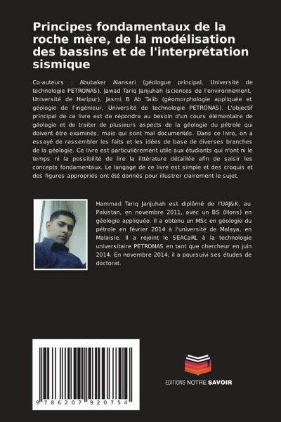 Co-auteurs : Abubaker Alansari (géologue principal, Université de technologie PETRONAS), Jawad Tariq Janjuhah (sciences de l'environnement, Université de Haripur), Jasmi B Ab Talib (géomorphologie appliquée et géologie de l'ingénieur, Université de technologie PETRONAS). L'objectif principal de ce livre est de répondre au besoin d'un cours élémentaire de géologie et de traiter de plusieurs aspects de la géologie du pétrole qui doivent être examinés, mais qui sont mal documentés. Dans ce livre, on a essayé de rassembler les faits et les idées de base de diverses branches de la géologie. Ce livre est particulièrement utile aux étudiants qui n'ont ni le temps ni la possibilité de lire la littérature détaillée afin de saisir les concepts fondamentaux. Le langage de ce livre est simple et des croquis et des figures appropriés ont été donnés pour illustrer clairement le sujet.