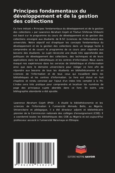 Ce livre intitulé « Principes fondamentaux du développement et de la gestion des collections » par Lawrence Abraham Gojeh et Tilahun Shiferaw Shibeshi est basé sur le programme du cours de développement et de gestion des collections enseigné aux étudiants de B.SC (sciences de l'information) des universités. Notre objectif est d'expliquer les concepts fondamentaux du développement et de la gestion des collections dans un langage facile à comprendre et de couvrir le programme de ce cours pour répondre aux besoins des étudiants. Le sujet nécessite une étude très approfondie des politiques de développement des collections, des techniques et de leurs applications dans les bibliothèques et les centres d'information. Nous avons évoqué nos expériences dans les services de bibliothèque et d'information ainsi que dans le domaine universitaire pour rédiger ce livre afin de répondre aux besoins de tous les étudiants en bibliothéconomie et en sciences de l'information et de tous ceux qui travaillent dans les bibliothèques et les centres d'information. Le livre est divisé en huit chapitres et rendu convivial par l'ajout d'un index très complet à la fin. L'index sera très pratique pour comprendre et localiser les numéros de page des principaux sujets abordés dans ce livre. En outre, une bibliographie abondante a été ajoutée.