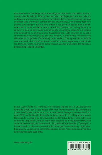 Actualmente las investigaciones fraseológicas brindan la posibilidad de abrir nuevas vías de estudio. Una de las vías más complejas pero a la vez más novedosas es la que supone acercarse al estudio de los fraseologismos y demás unidades fijas (paremias, comparaciones proverbiales, sentencias) desde un prisma culturológico. Este nuevo enfoque nos permite acercarnos simultáneamente a estas unidades desde una doble perspectiva: la lingüística y la cultural. Gracias a este doble acercamiento se consigue alcanzar un estudio más exhaustivo y completo de los fraseologismos. Este volumen se concibe como la continuación lógica de una obra anterior, Fundamentos teóricos de los Diccionarios Lingüístico-Culturales (Luque Nadal, 2010) y presenta un estudio pormenorizado de los fenómenos de creación de fraseologismos y el estudio de los dominios fuente y dominios meta, así como de los problemas de traducción que plantean dichas unidades.