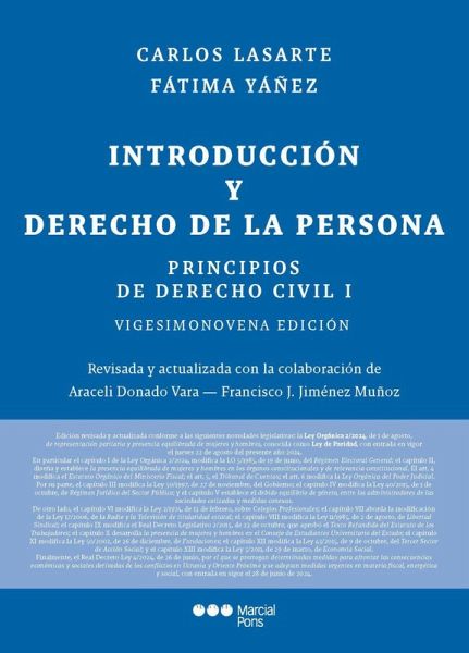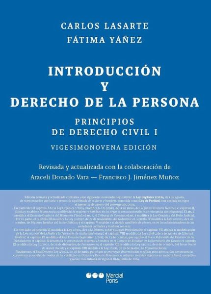 Son varias las razones que permiten enjuiciar admirativamente la obra del profesor Lasarte que inicia su andadura con este primer tomo dedicado, básicamente, al Derecho de la persona y a la tradicionalmente denominada 'Parte General' del Derecho civil. La primera de ellas, probablemente, radique en su vibrante y atractiva prosa, que carece de parangón en obras de similar naturaleza. A ella se suman sin duda su magnífica información bibliográfica y jurisprudencial, la riqueza de contenido y de aspectos reflexivos, así como su excelente actualización. La presente edición se encuentra rigurosamente actualizada, conforme a las nuevas disposiciones normativas de las que se ofrece ya un avance en la propia faja de cubierta de esta edición y, con mayor detalle y extensión, en el prólogo. En cuanto a novedades legislativas, se incorporan a esta edición: la Ley Orgánica 2/2024, de 1 de agosto, de representación paritaria y presencia equilibrada de mujeres y hombres, conocida popularmente como Ley de Paridad, con entrada en vigor el jueves 22 de agosto del presente año 2024. De otro lado, debemos mencionar el reciente Real Decreto Ley 4/2024, de 26 de junio, por el que se prorrogan determinadas medidas para afrontar las consecuencias económicas y sociales derivadas de los conflictos en Ucrania y Oriente Próximo y se adoptan medidas urgentes en materia fiscal, energética y social, con entrada en vigor el 28 de junio de 2024. Carlos Lasarte, Vocal de la Comisión General de Codificación, fue Catedrático de Derecho Civil de la Universidad de Sevilla (1980-1989) y Vocal de la Comisión Gestora de la Universidad Carlos III de Madrid (1989-1992). Desde octubre de 1989 es Catedrático de la Universidad Nacional de Educación a Distancia, en Madrid, habiendo sido Director del Departamento de Derecho Civil desde primeros de octubre de 1992 hasta finales de marzo de 2018. Durante el sexenio 2004-2010 fue Presidente de la Sección Española de la Comisión Internacional del Estado Civil, organismo internacional del que fue Presidente durante el año 2010. Desde el inicio del curso 2019/2020 ostenta la condición de Profesor Emérito de la UNED. Fátima Yáñez, Vicedecana de la Facultad de Derecho de la UNED (2013-2017), es Catedrática y Directora del Departamento de Derecho Civil en la UNED desde el año 2018, siendo autora de diversas monografías y numerosos artículos en sus líneas principales de investigación (fraude de acreedores, la responsabilidad civil de las personas con discapacidad, perfiles civiles del concurso de acreedores, y abuso de situaciones de debilidad y de ventaja injusta en los contratos). Es integrante, además, de Consejos editoriales de prestigiosas revistas (Revista Crítica de Derecho Inmobiliario, Actualidad Civil o Contratto e Impresa), al tiempo que forma parte de asociaciones internacionales de relevancia internacional, como Society of European Contract Law, Società Italiana degli Studiosi del Diritto Civile, habiendo sido oficialmente Profesora Visitante en las Universidades de Siena y Verona, en reiteradas ocasiones.