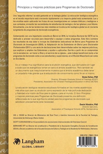 Una 'segunda reforma' se está gestando en la teología global. La educación teológica evangélica en el mundo mayoritario está creciendo rápidamente y su impacto global está aumentando. Las y los eruditos están aplicando los frutos de sus investigaciones en campos bíblicos y teológicos a sus contextos, sirviendo las necesidades de estudiantes de teología y de las iglesias y sus líderes. Actualmente, una de las tendencias más notables en la educación teológica global es el creciente surgimiento de programas de doctorado evangélicos. Comenzando con una importante consulta en Beirut en 2010, la Iniciativa Doctoral de ICETE se ha dedicado a proveer recursos para desarrollar y equipar a estos programas. Este libro contiene los resultados de esa labor e incluye los Estándares (educativos) de Beirut para Programas de Doctorado de Investigación (2010), la Adaptación de los Estándares de Beirut para Doctorados Profesionales (2011) y una serie de declaraciones bien desarrolladas sobre las mejores prácticas, que explican y amplían los Estándares y ayudan a aplicarlas. Escrito a partir de un compromiso con la excelencia -en honor a Dios y al servicio de su iglesia-, este trabajo beneficiará tanto a los programas de doctorado como a sus estudiantes y supervisores, en el Mundo Mayoritario así como en Occidente.