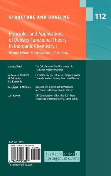 J. Autschbach: The Calculation of NMR Parameters in Transition Metal Complexes.- A. Rosa, G. Ricciardi, O. Gritsenko, E.J. Baerends: Excitation Energies of Metal Complexes with Time-dependent Density Functional Theory.- G. Ujaque, F. Maseras: Applications of Hybrid DFT/Molecular Mechanics to Homogeneous Catalysis.- J.N. Harvey: DFT Computation of Relative Spin-State Energetics of Transition Metal Compounds.