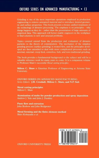 Grinding is one of the most important operations employed in Production Engineering to remove unwanted material and to introduce desired geometry and surface properties. Once considered only a secondary finishing operation, grinding is now more widely employed as suggested by the term, "abrasive machining". The approach to grinding taken here is to consider the basic processes in fundamental terms rather than to attempt to present a large mass of empirical results. Thus, the emphasis is placed on why things occur as they do rather than on specific solutions to problems ordinarily met. The rationale for this approach is that it better enables an engineer in the workshop to find solutions to new and unusual problems.