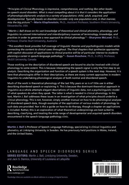 Those working on the description of disordered speech are bound to be also involved with clinical phonology to some extent. This is because interpreting the speech signal is only the first step to an analysis. Describing the organization and function of a speech system is the next step. However, it is here that phonologists differ in their descriptions, as there are many current approaches in modern linguistics to undertaking phonological analyses of both normal and disordered speech. Much of the work in theoretical phonology of the last fifty years or so is of little use in either describing disordered speech or explaining it. This is because the dominant theoretical approach in linguists as a whole attempts elegant descriptions of linguistic data, not a psycholinguistic model of what speakers do when they speak. The latter is what is needed in clinical phonology. In this text, Martin J. Ball addresses these issues in an investigation of what principles should underlie a clinical phonology. This is not, however, simply another manual on how to do phonological analyses of disordered speech data, though examples of the application of various models of phonology to such data are provided. Nor is this a guide on how to do therapy, though a chapter on applications is included. Rather, this is an exploration of what theoretical underpinnings are best suited to describing, classifying, and treating the wide range of developmental and acquired speech disorders encountered in the speech-language pathology clinic.