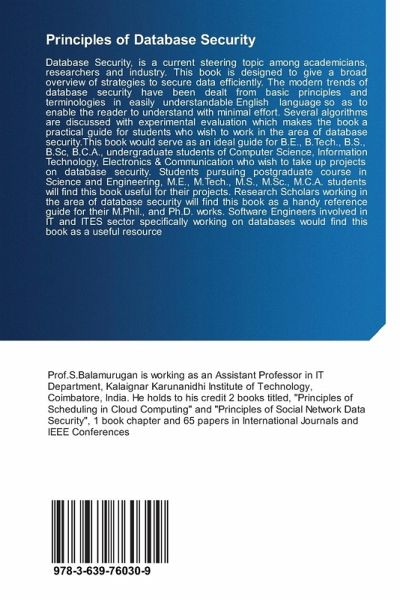 Database Security, is a current steering topic among academicians, researchers and industry. This book is designed to give a broad overview of strategies to secure data efficiently. The modern trends of database security have been dealt from basic principles and terminologies in easily understandable English language so as to enable the reader to understand with minimal effort. Several algorithms are discussed with experimental evaluation which makes the book a practical guide for students who wish to work in the area of database security.This book would serve as an ideal guide for B.E., B.Tech., B.S., B.Sc, B.C.A., undergraduate students of Computer Science, Information Technology, Electronics & Communication who wish to take up projects on database security. Students pursuing postgraduate course in Science and Engineering, M.E., M.Tech., M.S., M.Sc., M.C.A. students will find this book useful for their projects. Research Scholars working in the area of database security will find this book as a handy reference guide for their M.Phil., and Ph.D. works. Software Engineers involved in IT and ITES sector specifically working on databases would find this book as a useful resource