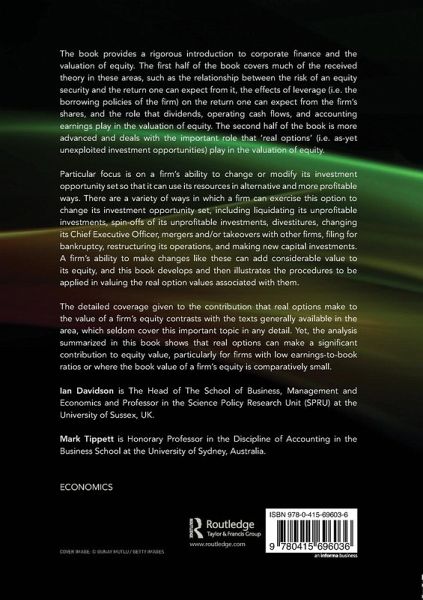 The book provides a rigorous introduction to corporate finance and the valuation of equity. The first half of the book covers much of the received theory in these areas such as the relationship between the risk of an equity security and the return one can expect from it, the effects of leverage (that is, the borrowing policies of the firm) on the return one can expect from the firm's shares and the role that dividends, operating cash flows and accounting earnings play in the valuation of equity. The second half of the book is more advanced and deals with the important role that "real options" (that is, as yet unexploited investment opportunities) play in the valuation of equity.