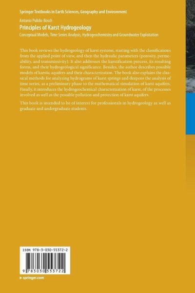 This book reviews the hydrogeology of karst systems, starting with the classifications from the applied point of view, and then the hydraulic parameters (porosity, permeability, and transmissivity). It also addresses the karstification process, its resulting forms, and their hydrogeological significance. Besides, the author describes possible models of karstic aquifers and their characterization. The book also explains the classical methods for analyzing hydrograms of karst springs and deepens the analysis of time series, as a preliminary phase to the mathematical simulation of karst aquifers. Finally, it introduces the hydrogeochemical characterization of karst, of the processes involved as well as the possible pollution and protection of karst aquifers.