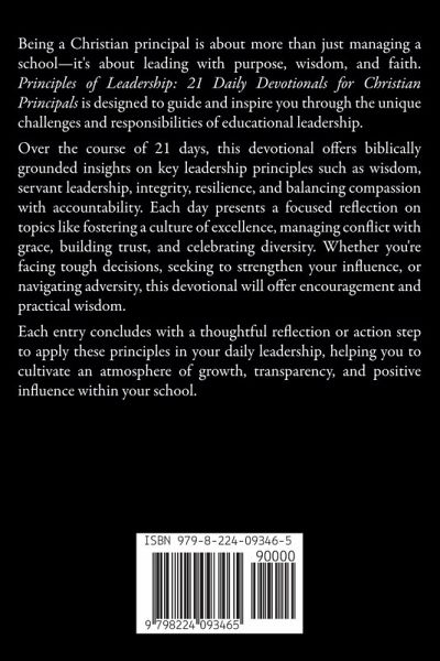 Being a Christian principal is about more than just managing a school-it's about leading with purpose, wisdom, and faith. Principles of Leadership: 21 Daily Devotionals for Christian Principals is designed to guide and inspire you through the unique challenges and responsibilities of educational leadership. Over the course of 21 days, this devotional offers biblically grounded insights on key leadership principles such as wisdom, servant leadership, integrity, resilience, and balancing compassion with accountability. Each day presents a focused reflection on topics like fostering a culture of excellence, managing conflict with grace, building trust, and celebrating diversity. Whether you're facing tough decisions, seeking to strengthen your influence, or navigating adversity, this devotional will offer encouragement and practical wisdom. Each entry concludes with a thoughtful reflection or action step to apply these principles in your daily leadership, helping you to cultivate an atmosphere of growth, transparency, and positive influence within your school.