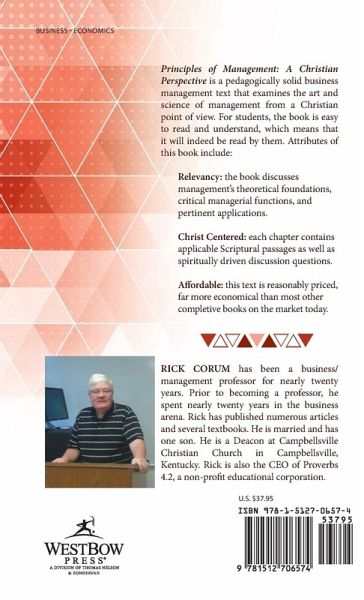 Principles of Management: A Christian Perspective is a pedagogically solid business management text that examines the art and science of management from a Christian point of view. For students, the book is easy to read and understand, which means that it will indeed be read by them. Attributes of this book include: Relevancy: the book discusses management's theoretical foundations, critical managerial functions, and pertinent applications. Christ Centered: each chapter contains applicable Scriptural passages as well as spiritually driven discussion questions. Affordable: this text is reasonably priced, far more economical than most other completive books on the market today.