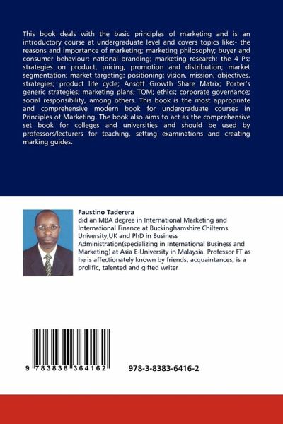 This book deals with the basic principles of marketing and is an introductory course at undergraduate level and covers topics like:- the reasons and importance of marketing; marketing philosophy; buyer and consumer behaviour; national branding; marketing research; the 4 Ps; strategies on product, pricing, promotion and distribution; market segmentation; market targeting; positioning; vision, mission, objectives, strategies; product life cycle; Ansoff Growth Share Matrix; Porter s generic strategies; marketing plans; TQM; ethics; corporate governance; social responsibility, among others. This book is the most appropriate and comprehensive modern book for undergraduate courses in Principles of Marketing. The book also aims to act as the comprehensive set book for colleges and universities and should be used by professors/lecturers for teaching, setting examinations and creating marking guides.
