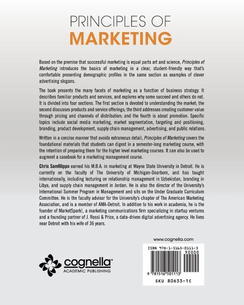 Based on the premise that successful marketing is equal parts art and science,Principles of Marketing introduces the basics of marketing in a clear, student-friendly way that’s comfortable presenting demographic profiles in the same section as examples of clever advertising slogans. The book presents the many facets of marketing as a function of business strategy. It describes familiar products and services, and explores why some succeed and others do not. It is divided into four sections. The first section is devoted to understanding the market; the second discusses products and service offerings; the third addresses creating customer value through pricing and channels of distribution; and the fourth is about promotion. Specific topics include social media marketing, market segmentation, targeting and positioning, branding, product development, supply chain management, advertising, and public relations. Written in a concise manner that avoids extraneous detail, Principles of Marketingcovers the foundational materials that students can digest in a semester-long marketing course, with the intention of preparing them for the higher level marketing courses. It can also be used to augment a casebook for a marketing management course. Chris Samfilippo earned his M.B.A. in marketing at Wayne State University in Detroit. He is currently on the faculty of The University of Michigan-Dearborn, and has taught internationally, including lecturing on relationship management in Uzbekistan, branding in Libya, and supply chain management in Jordan. He is also the director of the University’s International Summer Program in Management and sits on the Under Graduate Curriculum Committee. He is the faculty advisor for the University’s chapter of The American Marketing Association, and is a member of AMA-Detroit. In addition to his work in academia, he is the founder of MarketSpark!, a marketing communications firm specializing in startup ventures and a founding partner of J. Rossi & Price, a data-driven digital advertising agency. He lives near Detroit with his wife of 36 years.